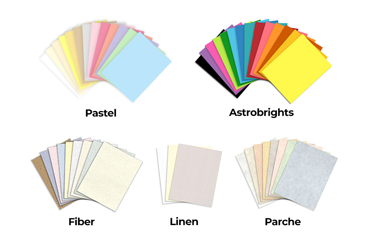 Along with the colored and textured paper shown in the image, we have many types of white paper ready for printing. From glossy card stock to bond paper, we have large selection available to meet your printing needs. come in and take a look at what we have, or give us a call and we'll fill you in.